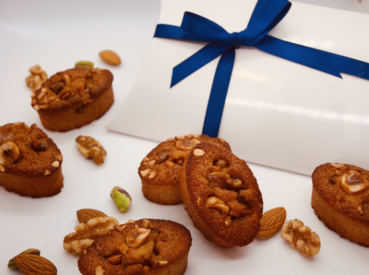 焦がしバターとキャラメルを贅沢に練り込んだコクのあるフィナンシェ生地に、ヘーゼルナッツや胡桃など数種類の木の実をのせて焼き上げた渾身の一品。